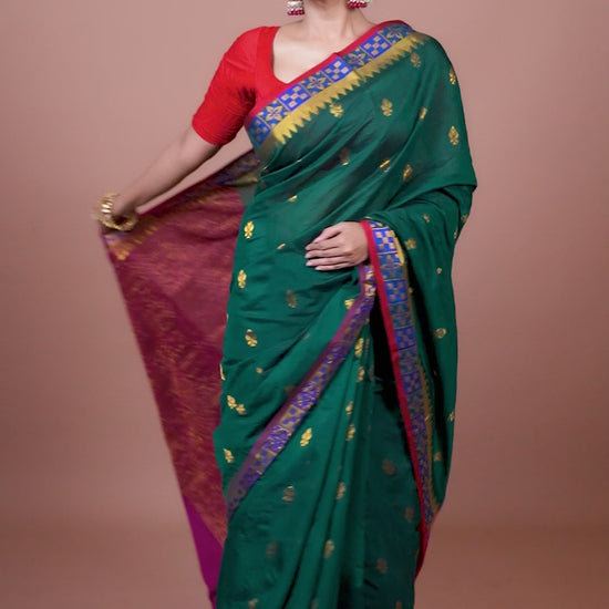 A beautifull Cotton saree with Bottle Green colour body, border, pallu.  Saree has fancy zari jaal with floral zari border and pallu. This lightweight saree is a captivating composition of vibrant artistry and rich heritage. It drapes beautifully, flattering every silhouette with grace and poise.