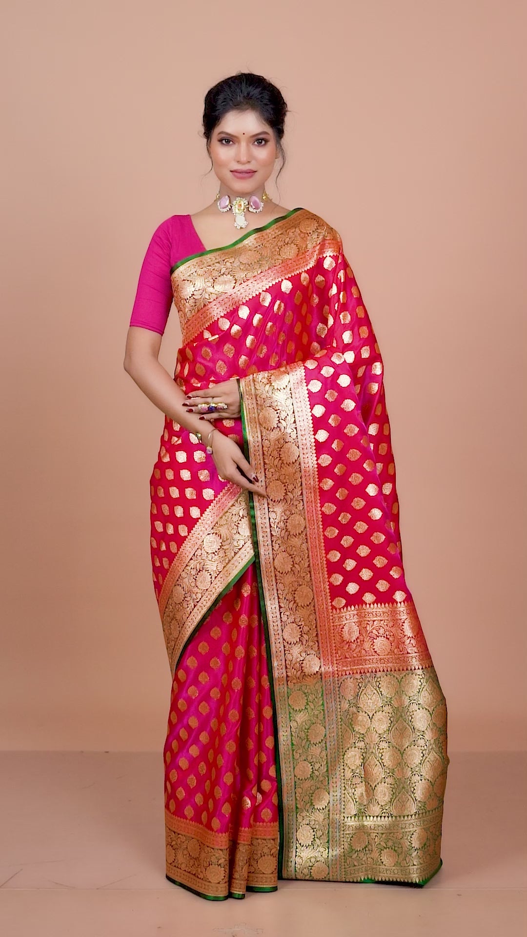 A beautifull green-pink colour banarasi saree with delicate zari motifs. Framed by a shimmering zari border and pallu, this saree is a captivating composition of vibrant artistry and rich heritage. It drapes beautifully, flattering every silhouette with grace and poise.
