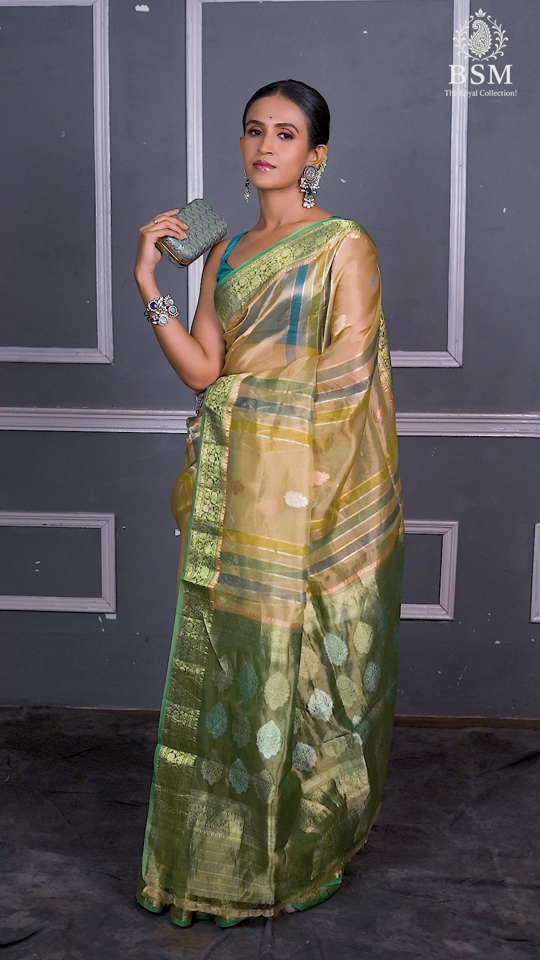 A stunning pure Tissue silk saree with a Pastel colour. The saree features a beautiful antique zari booti with a pallu and a flowery zari border. This airy saree is a stunning blend of rich tradition and colorful craftsmanship. It drapes exquisitely, gracefully and poisedly enhancing every silhouette.
