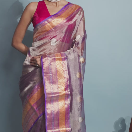 Pink Grey Pure Tissue Silk Banarasi Handloom Saree with Zari work