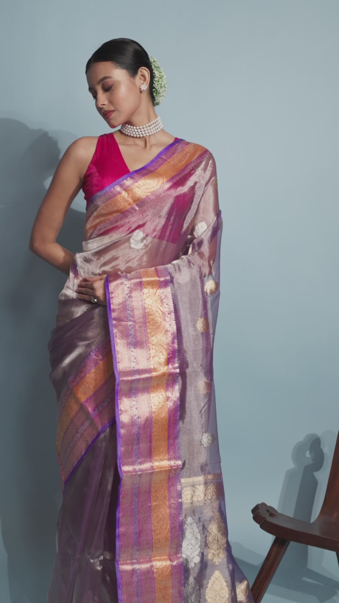 A stunning pure Tissue silk saree with a pink colour. The saree features a beautiful antique zari booti with a pallu and a flowery zari border. This airy saree is a stunning blend of rich tradition and colorful craftsmanship. It drapes exquisitely, gracefully and poisedly enhancing every silhouette.