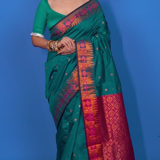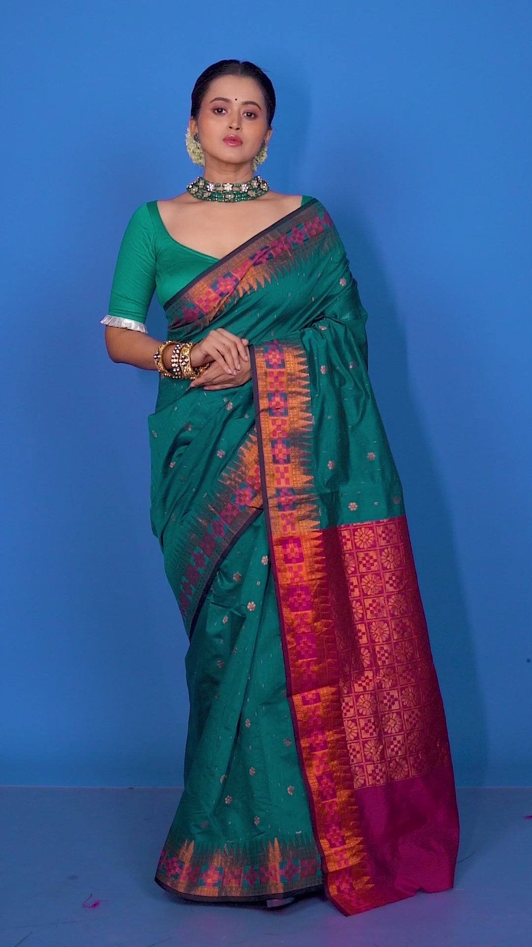 A beautifull Cotton saree with Rama green colour body, border, pallu.  Saree has fancy zari jaal with floral zari border and pallu. This lightweight saree is a captivating composition of vibrant artistry and rich heritage. It drapes beautifully, flattering every silhouette with grace and poise.