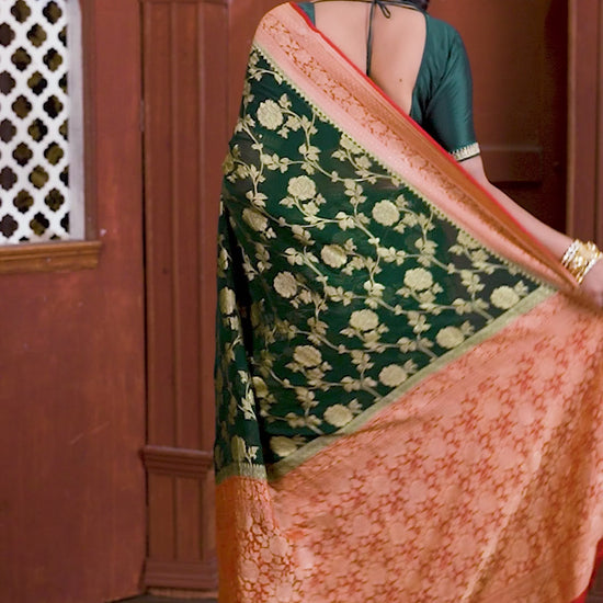 Red Bottle Green Pure Chiffon Silk Khaddi Georgette Banarasi Handloom Saree with Zari work