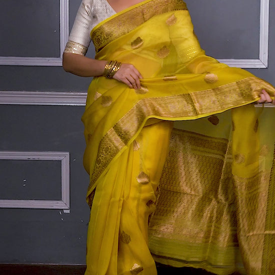 Yellow Pure Organza Silk Banarasi Handloom Saree with Zari work